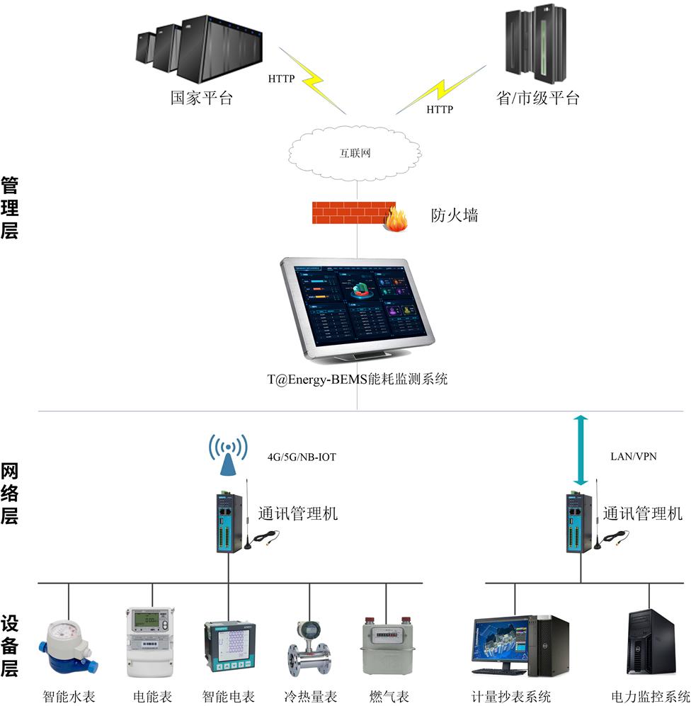 網絡層:以建筑內部通訊管理機及相關網絡線路組成,通訊管理機用于末端計量表計和第三方監測系統內能耗數據的采集、存儲、協議轉換并上傳至“能耗管理一體機”。根據監測點位的數量和位置不同,可任意擴展通訊管理機的數量。