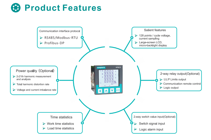 KPM10 three-phase multi-function power meter was designed that using advanced 32-bit ARM processor and digital signal processing technology comprehensive set of three-phase electrical parameter measurement / display, power accumulation, fault alarm, harmonic measurement, digital inputs, relays Output and network communications in one. Standard 72 panel, large screen LCD screen, standard 1-way RS485 communication interface. With high precision, strong isolation, stable performance, anti-interference ability etc.
