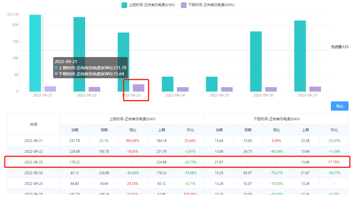 找到異常點。可以通過柱狀圖和圖表,發現9月23日的下班時間能耗要大于一周的平均能耗: