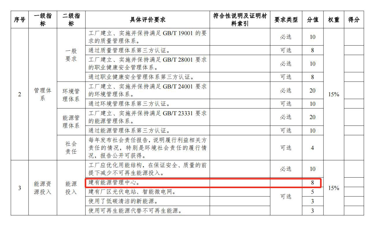 綠色工廠:根據工業和信息化部2024年1月19日關于印發工信部節〔2024〕13號《綠色工廠梯度培育及管理暫行辦法》的通知中第五章配套機制中第二十二條、第二十三條、對綠色工廠企業提供規劃布局、技術改造、專項資金申請、政府采購、試點示范、金融服務、品牌宣傳等方面的支持。同時,附表1.1.2綠色工廠評價指標第三方評價表一級指標中能源資源投入的二級指標能源投入的具體評價要求中建有能源管理中心可以+8分。如下圖: