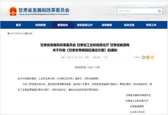 2026年1月30日,甘肅省發(fā)展和改革委員會(huì)、甘肅省工業(yè)和信息化廳、甘肅省能源局發(fā)布關(guān)于印發(fā)《甘肅省零碳園區(qū)建設(shè)方案》的通知(甘發(fā)改環(huán)資〔2026〕51號(hào))。