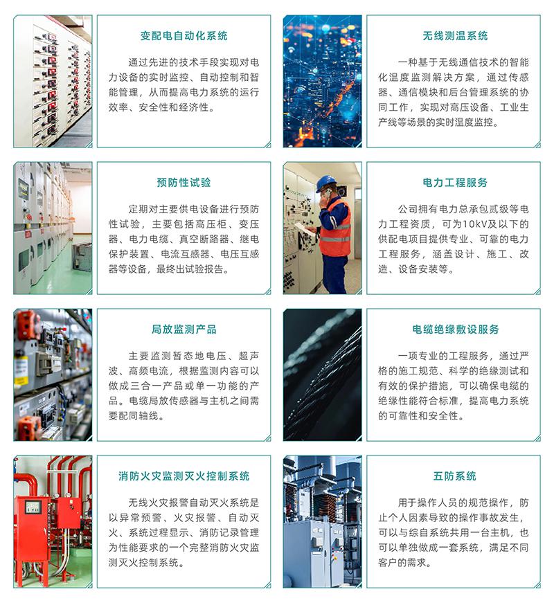 電力綜合服務(wù)聚焦電力系統(tǒng)全生命周期保障:以變配電自動(dòng)化系統(tǒng)提升設(shè)備運(yùn)維效能,通過(guò)無(wú)線測(cè)溫、局放監(jiān)測(cè)產(chǎn)品精準(zhǔn)掌握設(shè)備狀態(tài),輔以核心設(shè)備預(yù)防性試驗(yàn)提前規(guī)避故障,同時(shí)提供電力全鏈條工程服務(wù),并配套電纜絕緣敷設(shè)、消防火監(jiān)監(jiān)測(cè)滅火控制系統(tǒng)、五防系統(tǒng)構(gòu)建全場(chǎng)景安全防護(hù),全方位支撐電力系統(tǒng)安全、高效穩(wěn)定運(yùn)行。