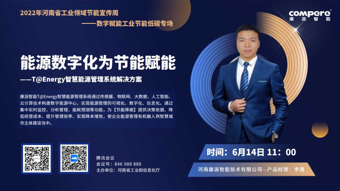 2022年6月,響應國家發改委與河南省工信廳“節能宣傳周”活動要求,康派智能積極響應,主動配合完成數字賦能工業節能低碳專場活動,以線上宣傳的方式,向社會及工業企業完成主題為《能源數字化為節能賦能--T@Energy智慧能源管理系統解決方案》的宣講活動。