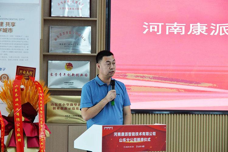 揭牌儀式上,東營市企業人才發展促進中心主任孫玉林向康派智能山東分公司的成立表示熱烈祝賀。他表示,在康派智能為東營市工業企業提供過服務的項目中,親眼見證了康派智能在技術應用、產品質量和客戶服務方面務實的作風和工作態度。今天,康派智能選擇東營作為分公司的落戶之地,不僅體現了公司對東營市場的重視和信心,也為我們東營市的智能制造和工業互聯網發展注入了新的活力和動力。
