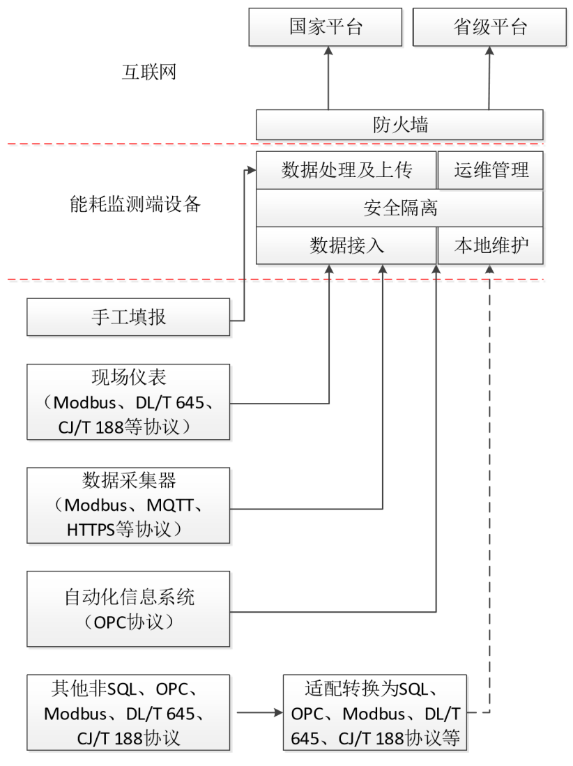 端設備支持SQL、OPC、MODBUS、DL/T 645、CJ/T188協議,能耗在線監測端設備對采集到的數據進行匯總,驗證、篩選、整理打包后,采用“CA認證+HTTPS協議+VPN專線”方式多重加密將數據傳輸至省級平臺。