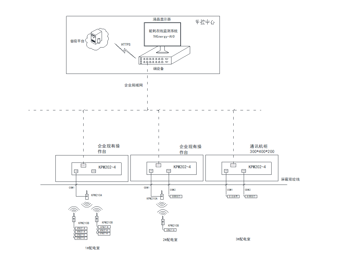網絡通信設計:1#配電室位于東廠區,配電室內有東、西兩排柜子,其中污水處理監測點和低壓總進線監測點位于東邊配電柜,共計4個監測點共用一臺無線LORA發送端。數據通過企業局域網將數據傳輸至康派智能端設備